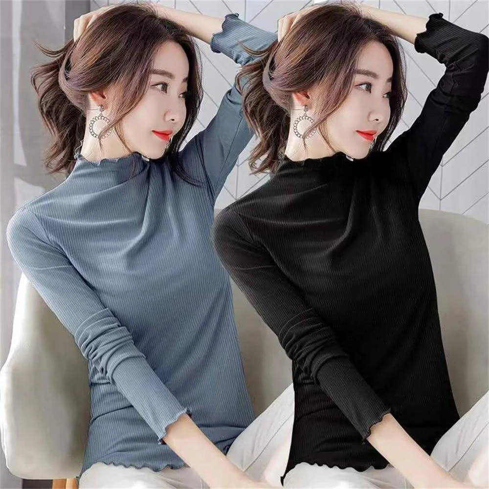 螺紋打底衫女木耳邊半高領修身長袖t恤白色百搭上衣(韓風大碼)