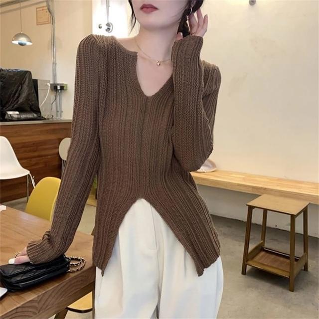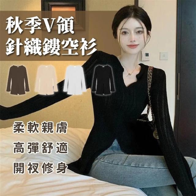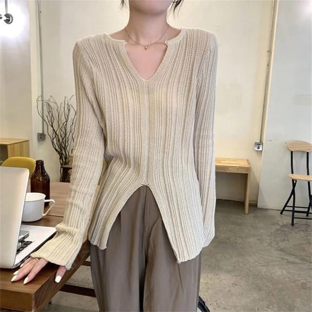 (韓風女装)氣質v領設計感長袖針織衫女春季新款內搭打底衫修身開叉上衣慵懶