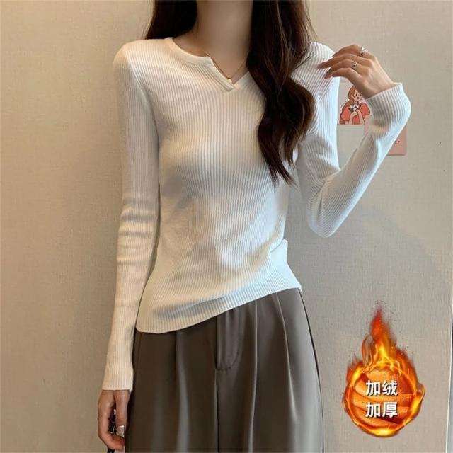 (韓風大碼)大尺碼上衣 大碼女裝 加絨加厚秋冬大碼針織打底衫女寬松修身保暖內搭v領長袖上衣