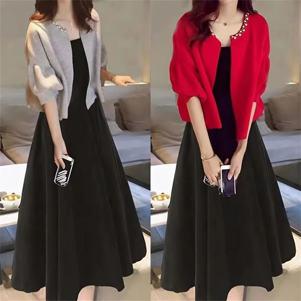 (韓風大碼)M-4XL 大尺碼 大碼女裝 秋裝新款小香風兩件套釘珠小外套裝中長款針織顯瘦連衣裙