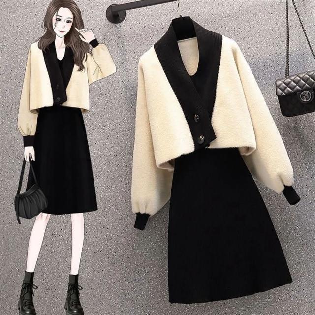(韓風大碼)大尺碼套裝 大碼女裝 休閒套裝 秋冬季新款小香風寬松短款針織開衫顯瘦連衣裙兩件