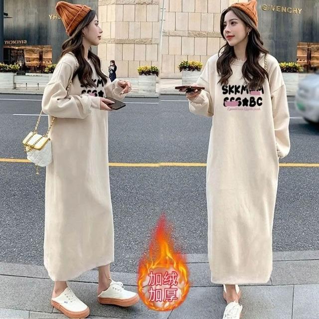 (韓風大碼)大尺碼洋裝 大碼女裝 連衣裙女春秋長袖寬松爆款簡約長裙秋冬款加絨保暖長款過膝懶人裙