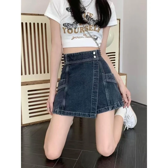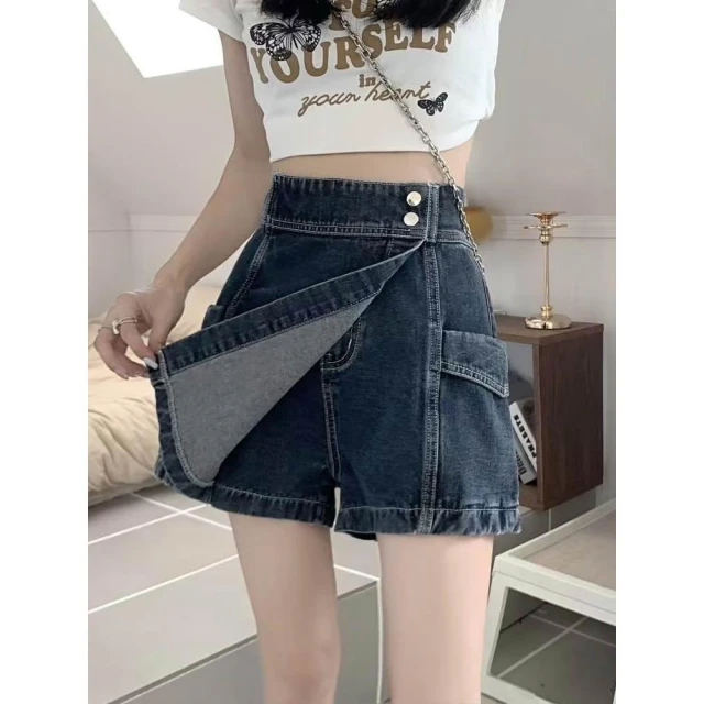 (韓風大碼)大尺碼女裝 褲裙 裙褲 胖mm高腰牛仔短褲女 夏季 不規則a字半身裙設計感直筒闊腿褲裙