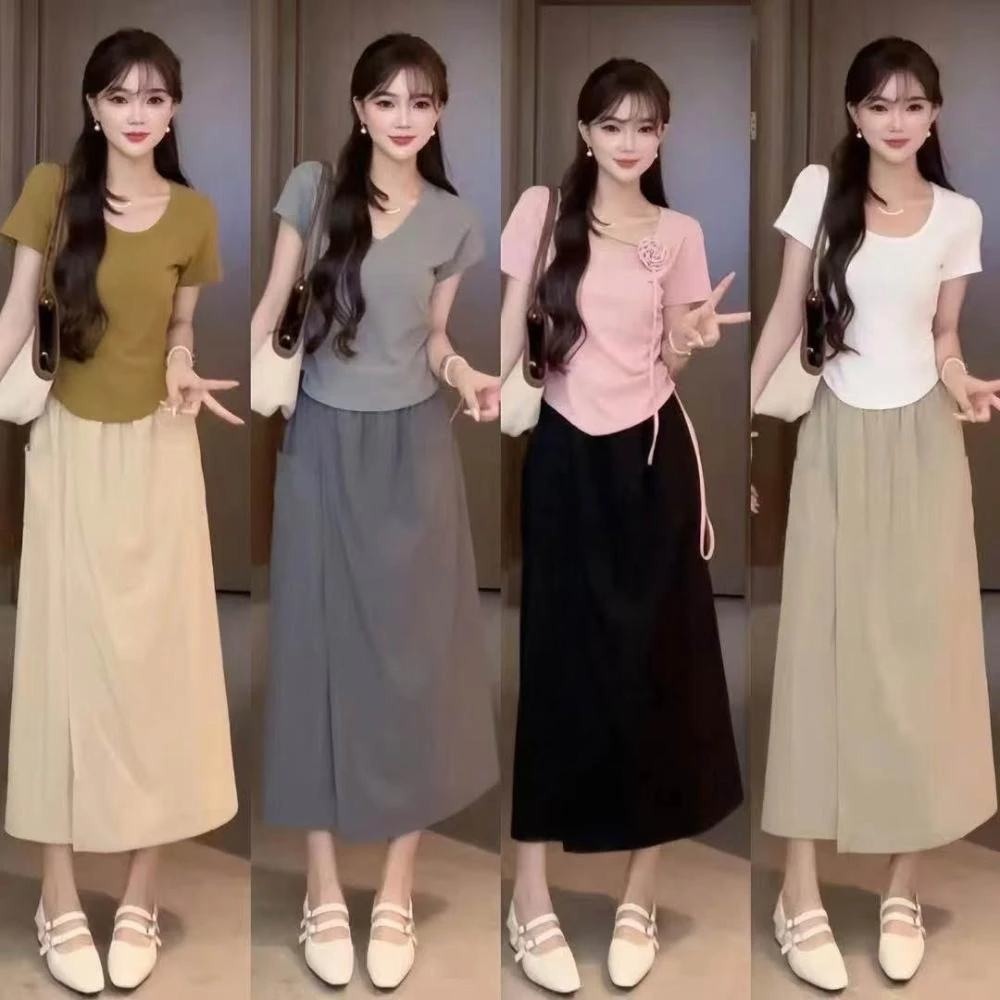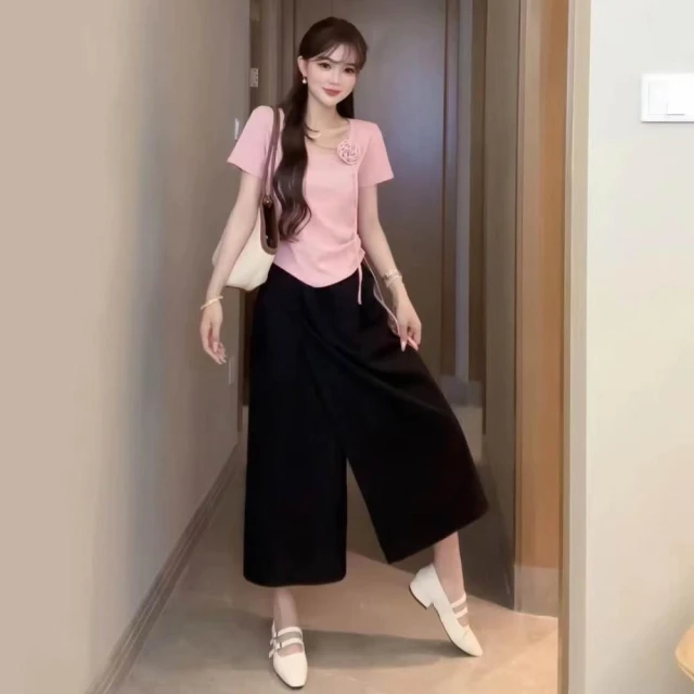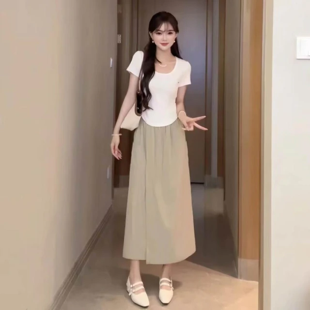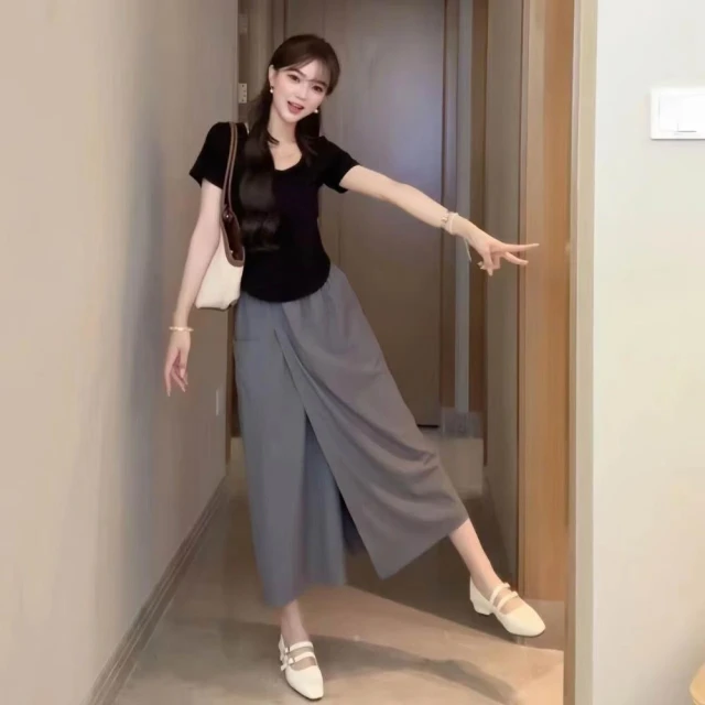 (韓風大碼)大尺碼褲裙 七分褲 寬褲 夏季高腰設計感褲裙直筒闊腿休閑七分褲顯瘦時尚開叉中長款大擺