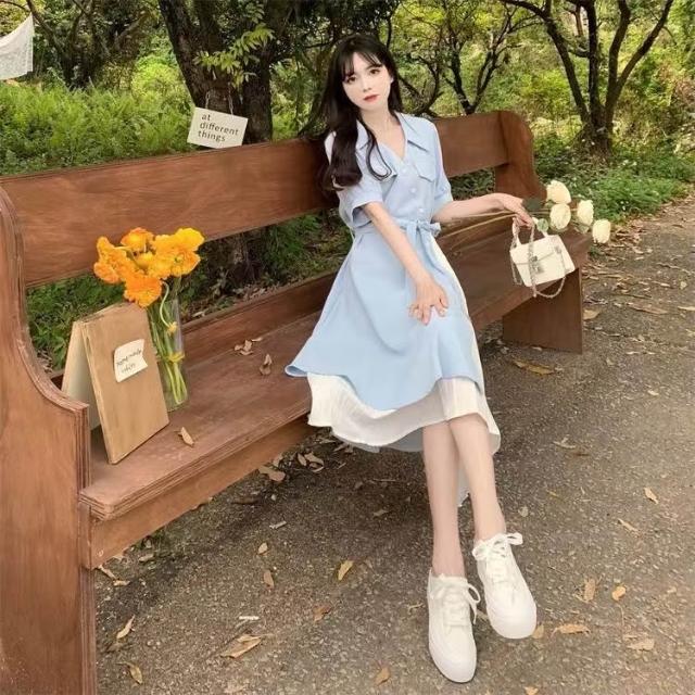 (韓風大碼)大尺碼洋裝 連身裙 法式V領長裙 不規則連衣裙 顯瘦洋裝 短袖洋裝 假兩件洋裝