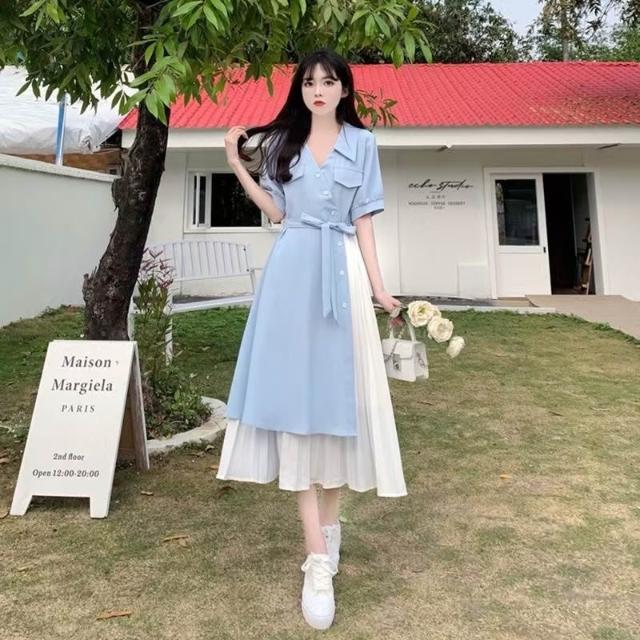 (韓風大碼)大尺碼洋裝 連身裙 法式V領長裙 不規則連衣裙 顯瘦洋裝 短袖洋裝 假兩件洋裝