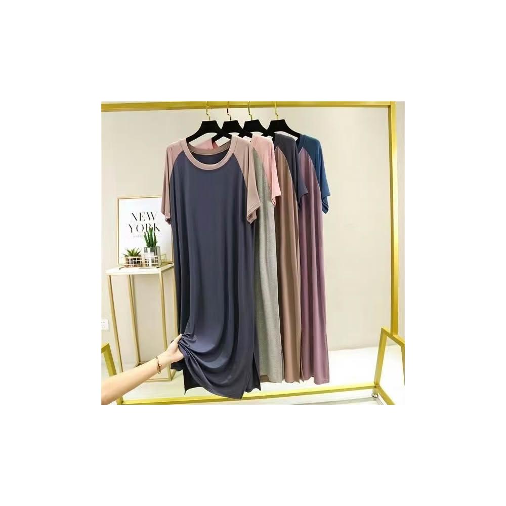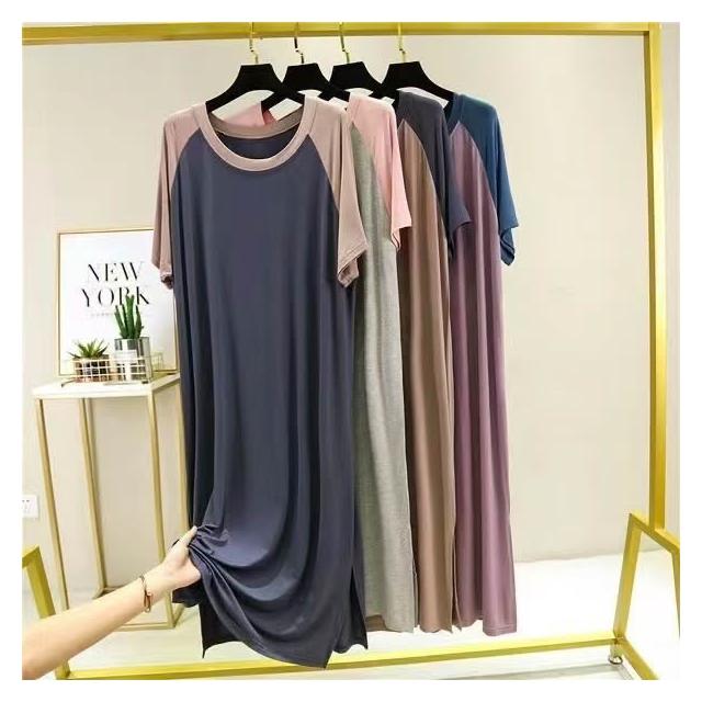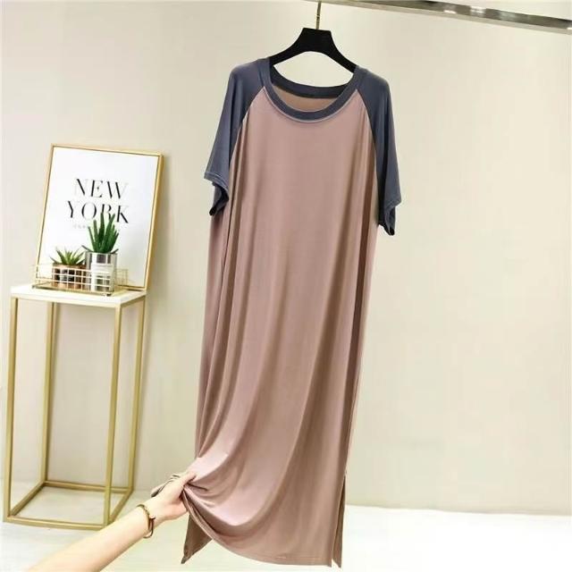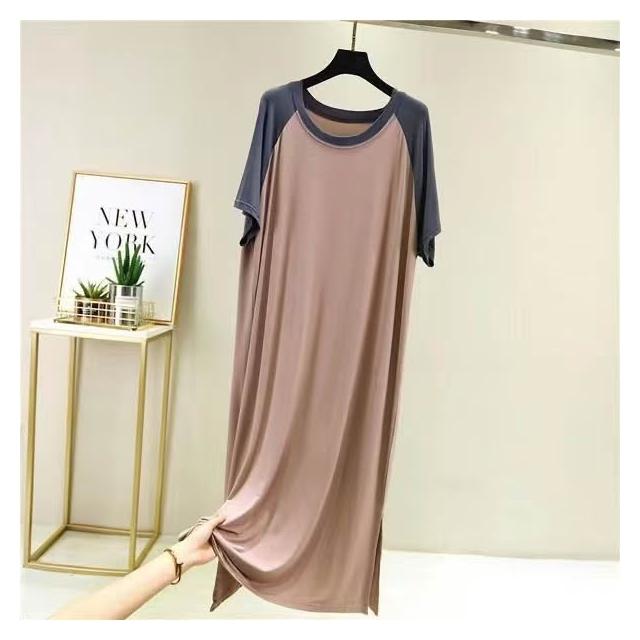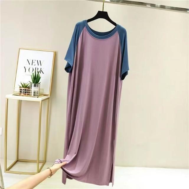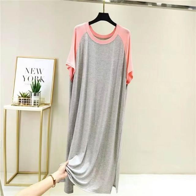 (韓風大碼)大尺碼睡衣 莫代爾寬鬆睡裙 大碼圓領拼接短袖連衣裙 家居服 連身睡裙