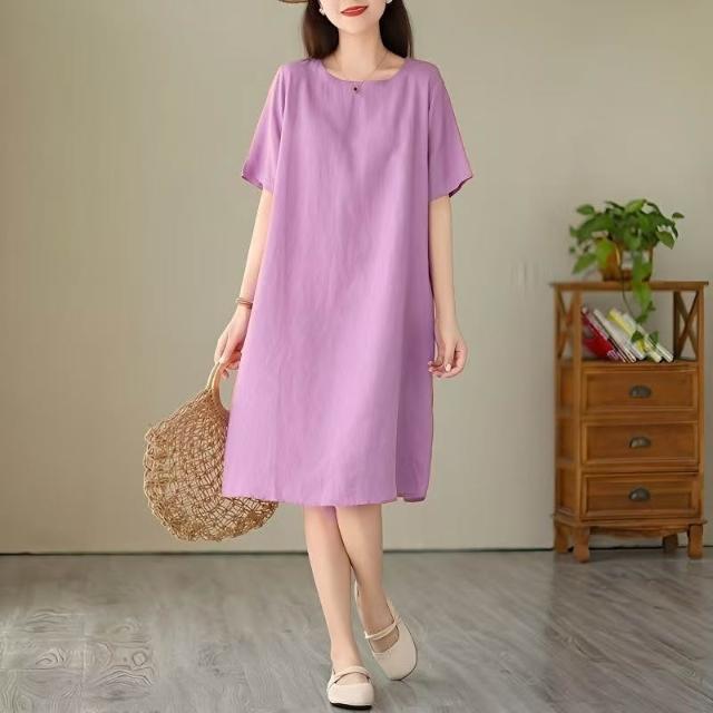 (韓風大碼)大尺碼夏季簡約純色寬鬆遮肚子圓領中長款棉麻裙子 洋裝 連身裙 短袖連衣裙