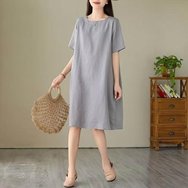 (韓風大碼)大尺碼夏季簡約純色寬鬆遮肚子圓領中長款棉麻裙子 洋裝 連身裙 短袖連衣裙