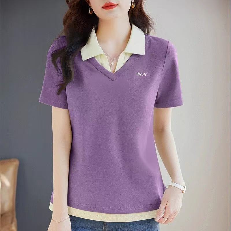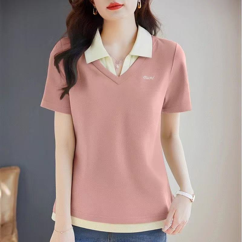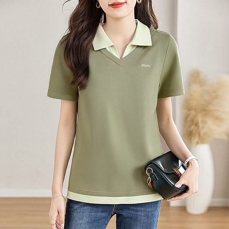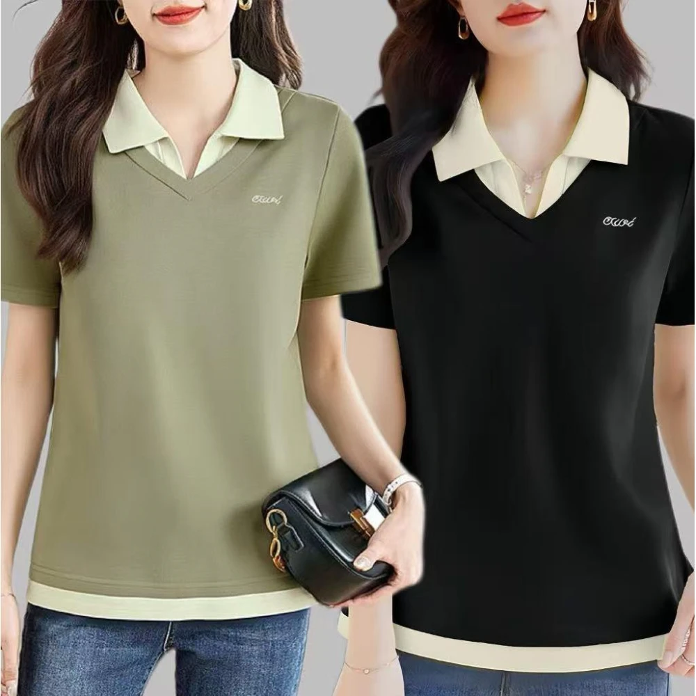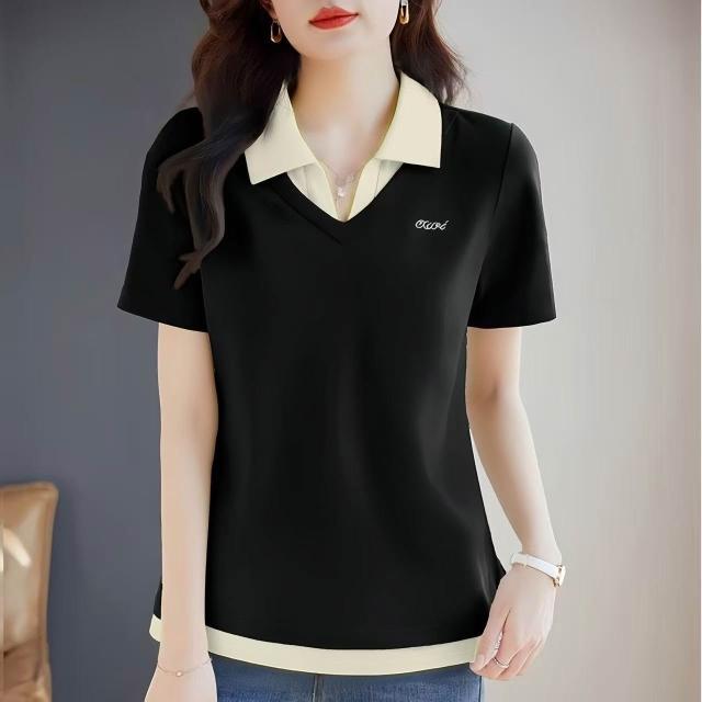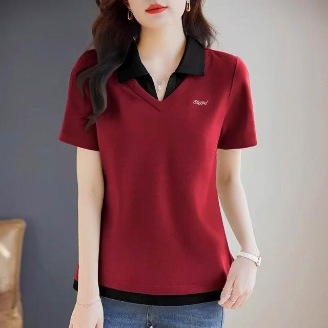 (韓風大碼)大尺碼夏季時尚洋氣假兩件翻領短袖t恤女 短袖上衣 polo衫