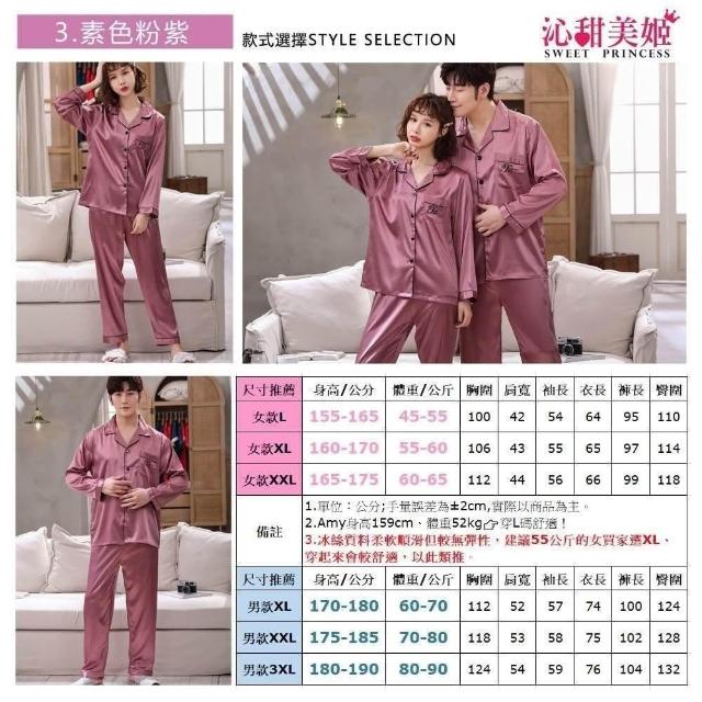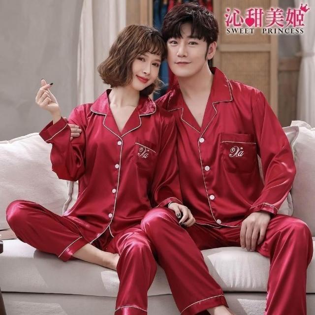 沁甜美姬韓系簡約男女長袖冰絲緞面情侶睡衣組(多色任選/柔滑親膚/舒適寬鬆/情侶居家服套裝)