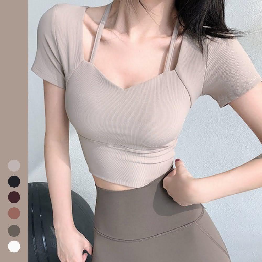 Muses短袖瑜珈服 運動瑜伽服 健身上衣女 瑜珈服裝 帶胸墊設計 親膚透氣 羅紋修身 顯瘦效果40-80kg
