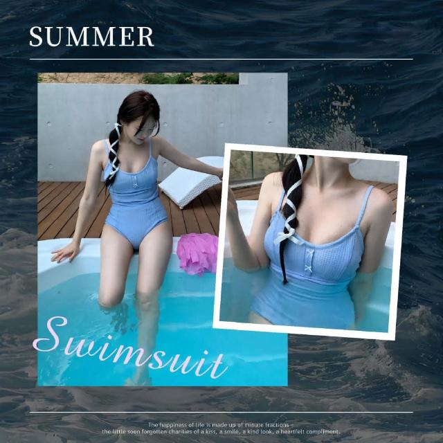 Muses青少女泳裝 連身式泳衣 小胸部泳衣 泳衣連身裙 細肩帶設計 蝴蝶結點綴 收腰連體 華夫格壓紋45-64kg