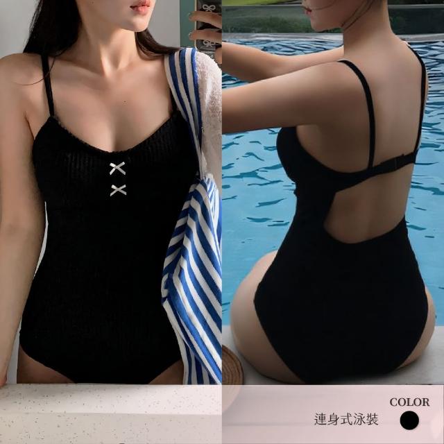 Muses青少女泳裝 連身式泳衣 小胸部泳衣 泳衣連身裙 細肩帶設計 蝴蝶結點綴 收腰連體 華夫格壓紋45-64kg
