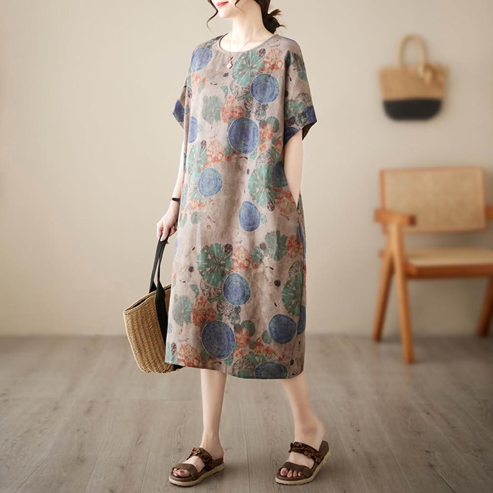 AKARAAKARA 涼感 棉麻 大碼 清質感棉麻拓印畫短袖洋裝 3XL可