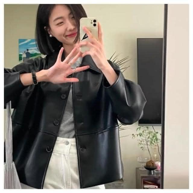 AKARAAKARA 中大服飾 女裝 經典翻領排扣仿皮皮衣短版夾克外套 M-3XL 現+預