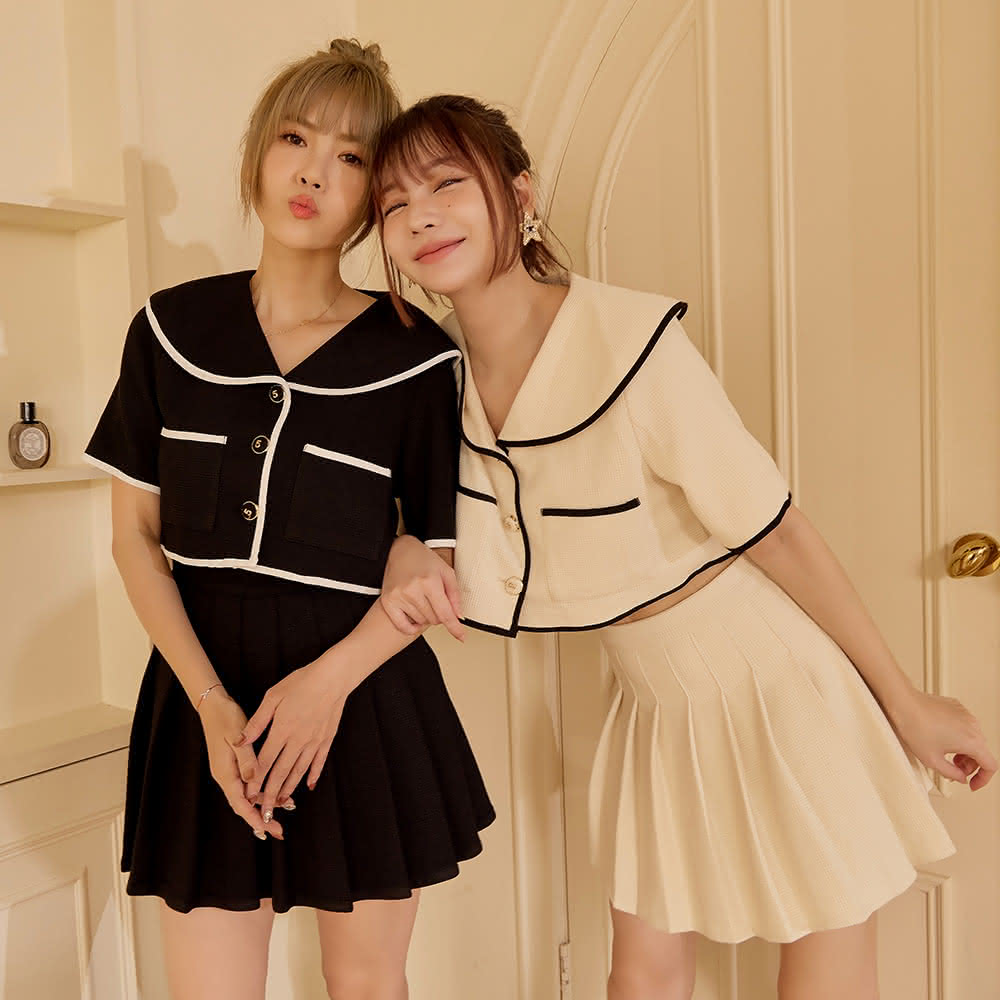 N147大尺碼 棉花糖女孩 華夫格大翻領短版上衣+同款百褶裙 學院套裝 Y2455B韓國女裝/現貨商品/預購