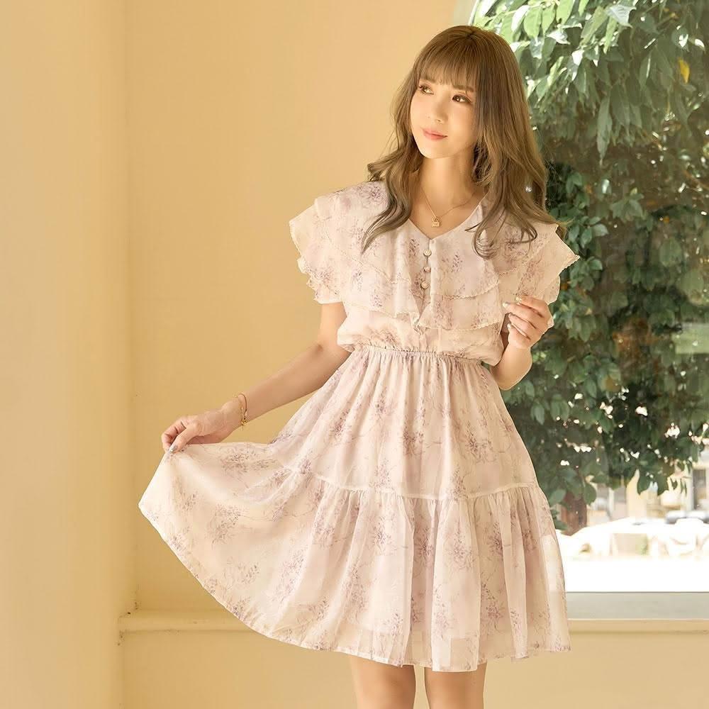 N147雙層荷葉滿版花繪質感雪紡短洋裝《P591》花漾紫韓國女裝/現貨商品+預購