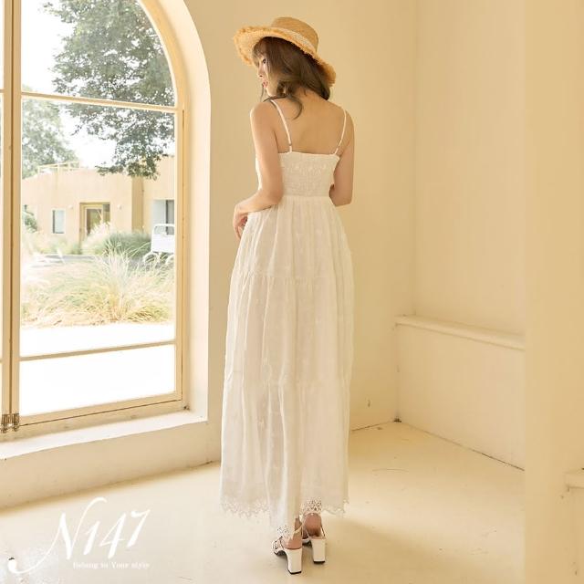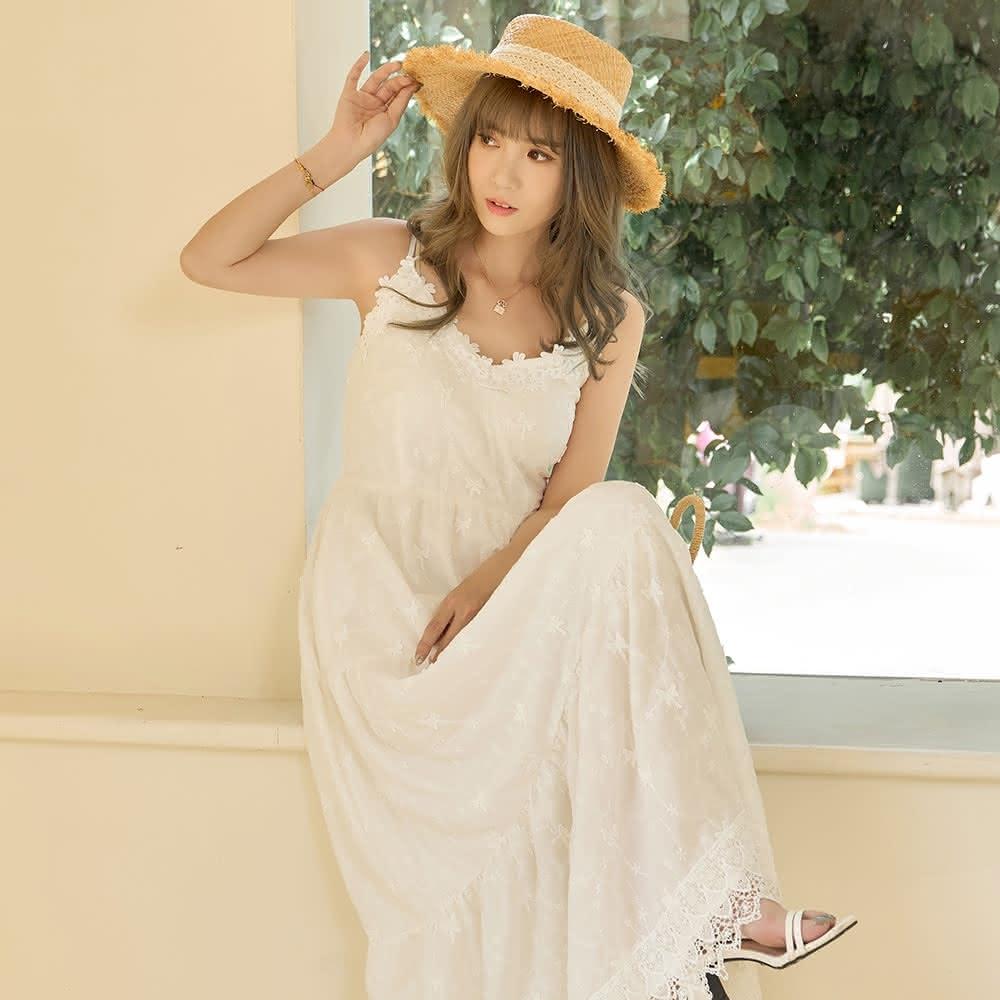 N147立體刺繡V領細肩帶棉麻長洋裝《P587》渡假洋裝 戀愛白