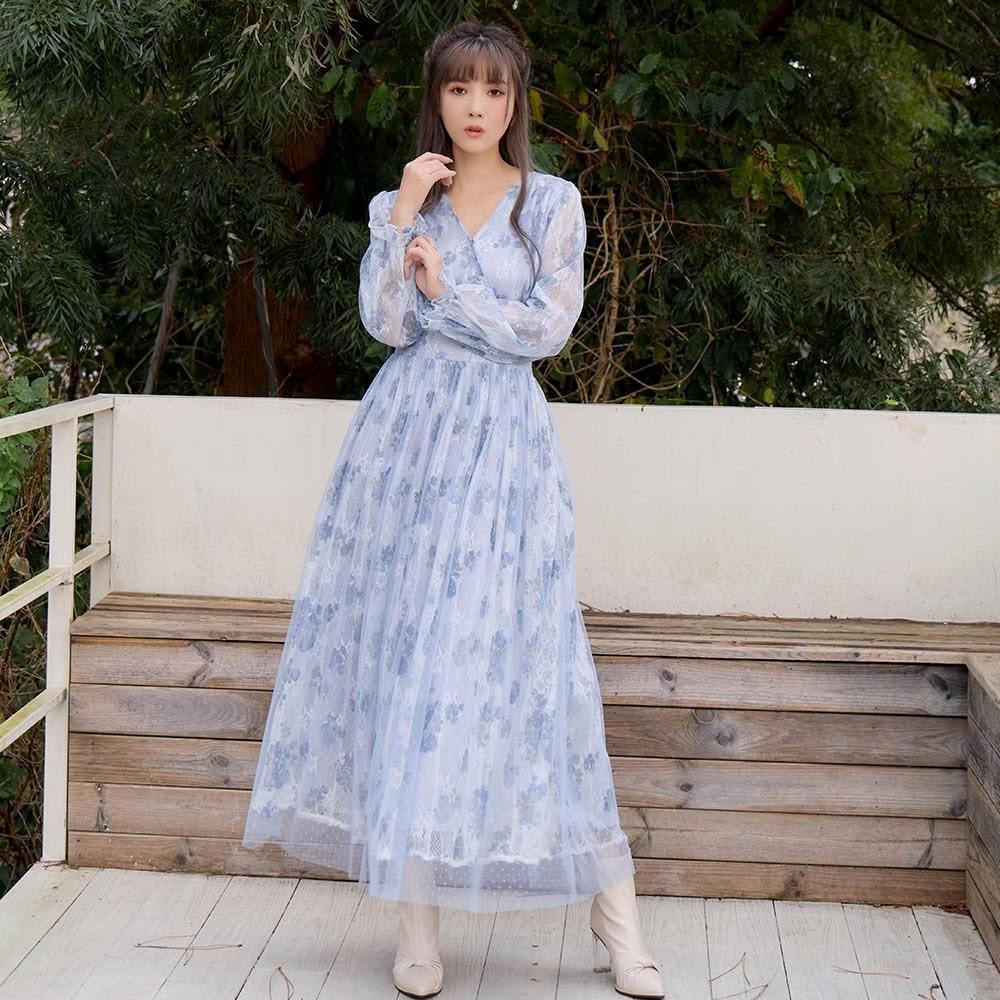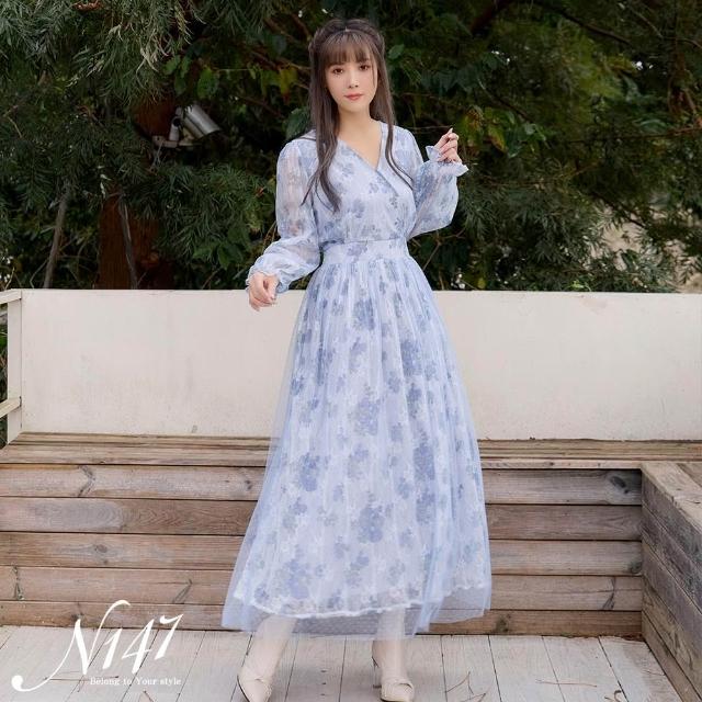 N147V領微透膚蕾絲網紗浪漫長洋裝《P723》唯美藍
