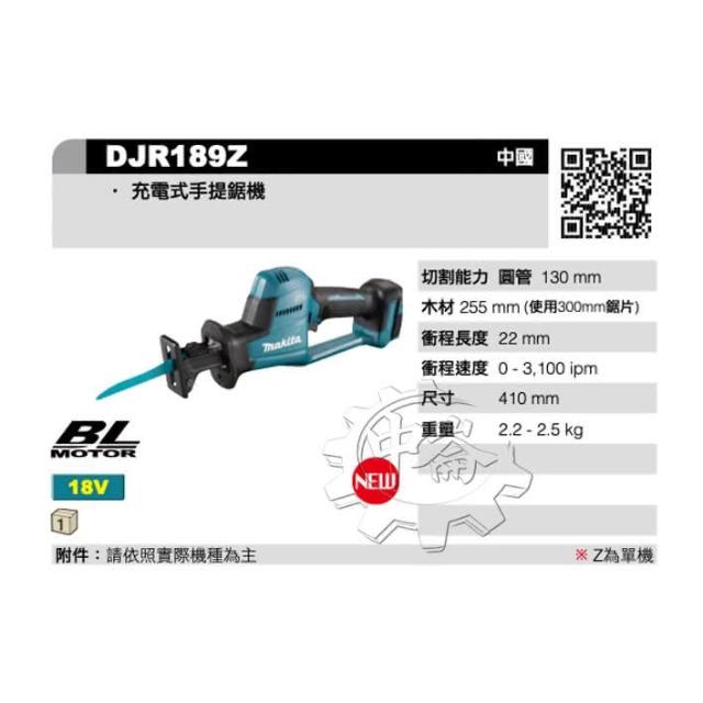 MAKITA 牧田18V充電式無刷手提鋸機 單手軍刀鋸 DJR189Z DJR189 單機+選項 中崙五金