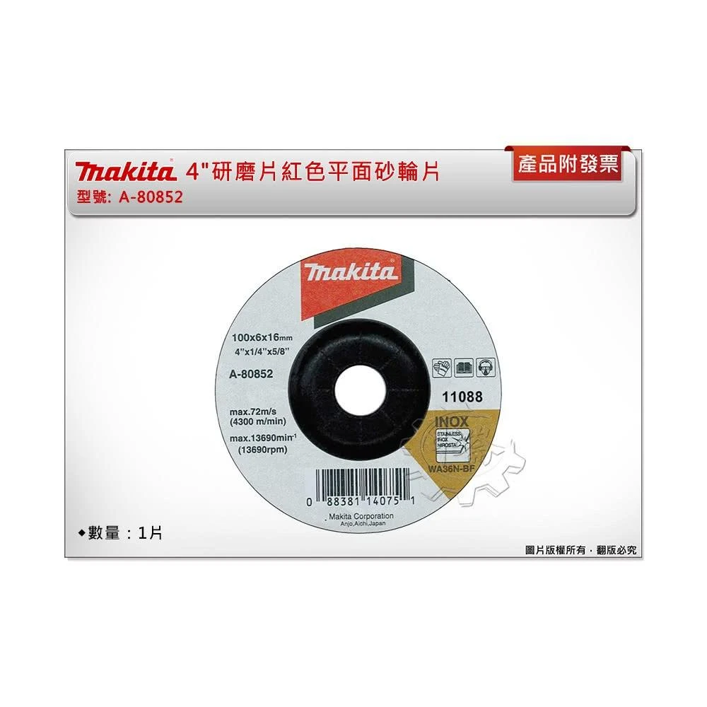 MAKITA 牧田紅色平面砂輪片一片 研磨片 4 - 厚度6MM A-80852 中崙五金