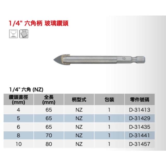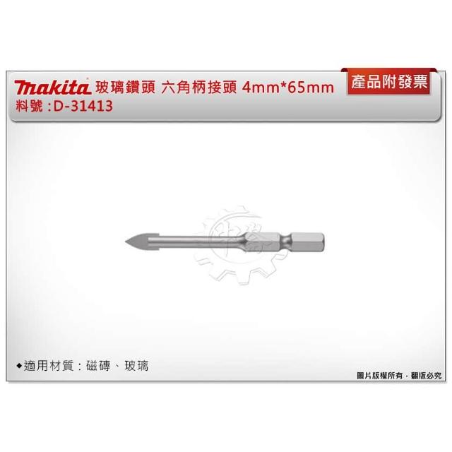 MAKITA 牧田玻璃鑽頭 4mm*65mm D-31413 六角柄 快速接鑽尾 適用玻璃、磁磚 中崙五金