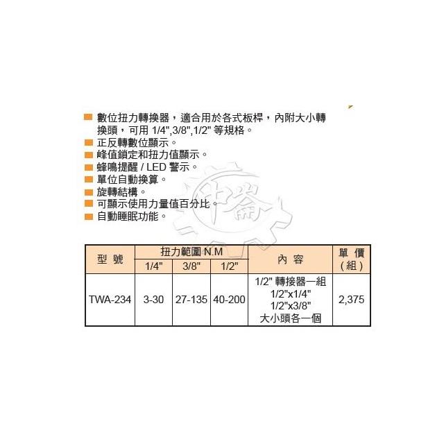 ALSTRONG台灣製3合一數位式扭力轉換器 TWA-234 適用各式板桿 內附大小轉換頭 中崙五金
