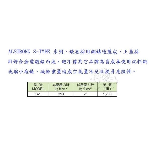 ALSTRONG台灣製 氧氣調整錶酸素錶 S-1 氧氣壓力調整器 焊切工具 錶底採用銅鑄造製成 中崙五金