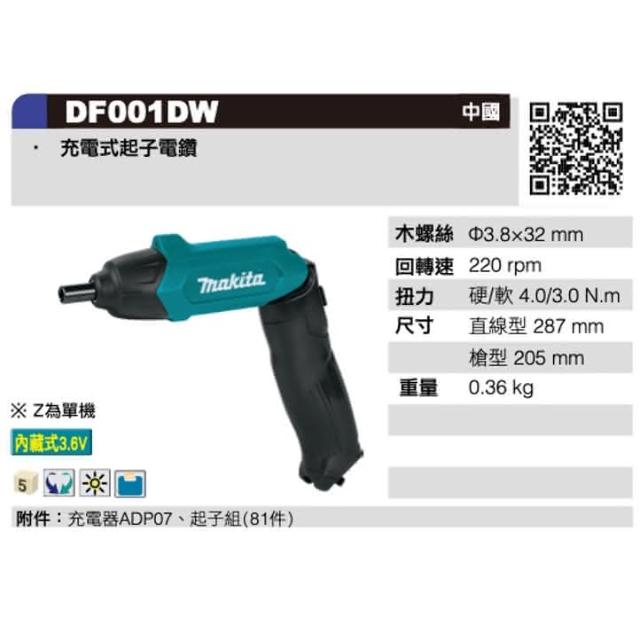 MAKITA 牧田原廠 DF001DW 3.6V折疊充電式電鑽起子機 DF001 套裝組 電動起子機 電動螺絲起子機 電鑽起子機 中崙五金