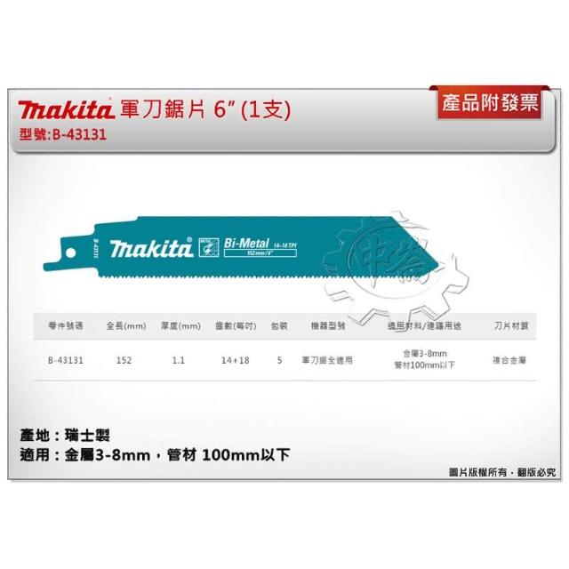 MAKITA 牧田瑞士製 軍刀鋸片 B-43131 長度6吋 複合金屬 適用金屬、管材一卡5支 中崙五金