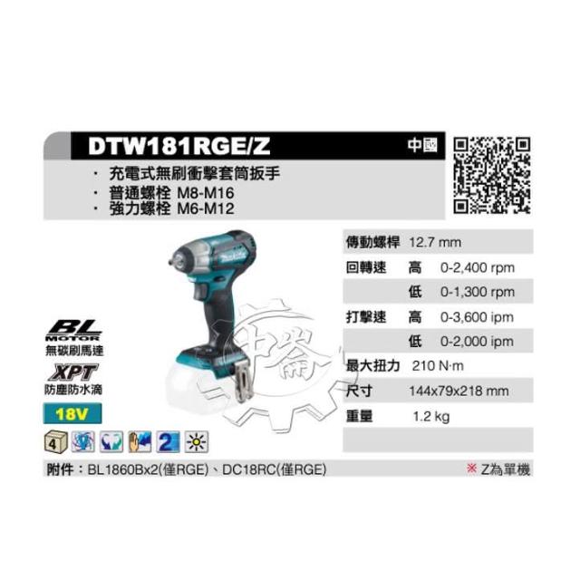 MAKITA 牧田18V 4分無刷衝搫套筒板手 DTW181RGE DTW181Z 無刷板手機 DTW181 單機+選項 中崙五金