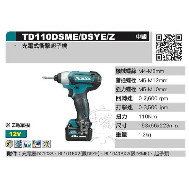 MAKITA 牧田12V 充電式衝擊起子機 TD110DZ 單機+選項 TD110DSME TD110DSYE 電動螺絲起子機 中崙五金