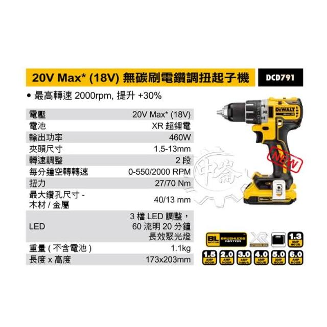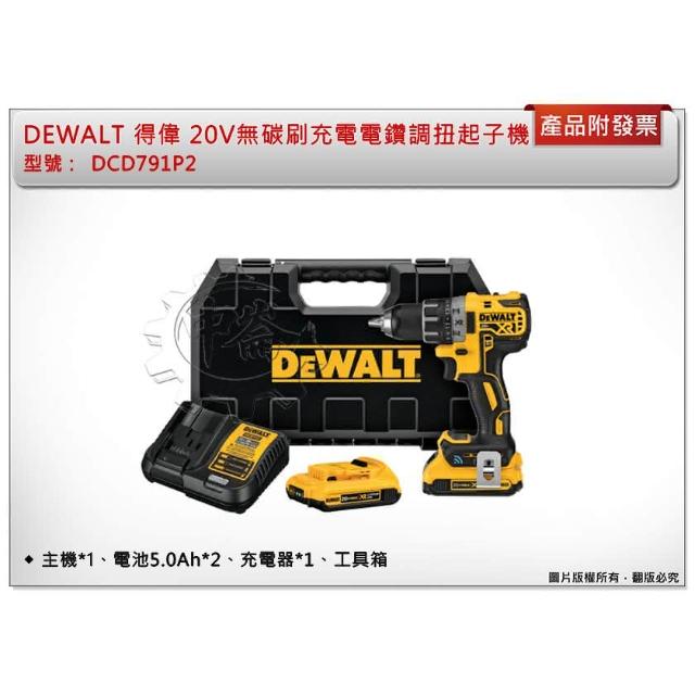 DEWALT 得偉20V Max 無碳刷充電電鑽調扭起子機 DCD791B DCD791P2 電動螺絲起子機 電鑽起子機 中崙五金