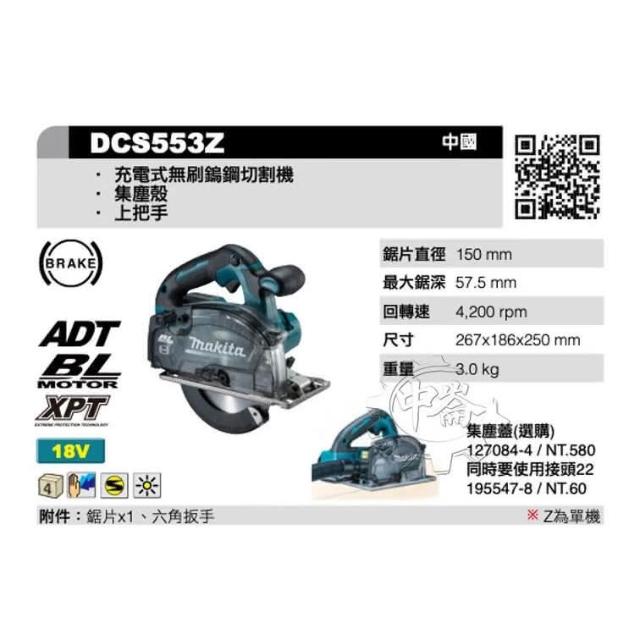 MAKITA 牧田附鋸片+集塵盒18V無刷切割機 金屬鎢鋼切割機 DCS553Z DCS553 單機+選項 中崙五金