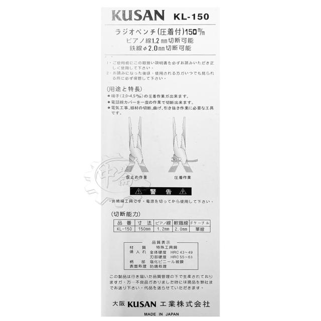 KUSAN 尖嘴鉗 KL-150(附壓著功能)鋼絲鉗 破壞鉗 老虎鉗 高碳鋼材質 中崙五金