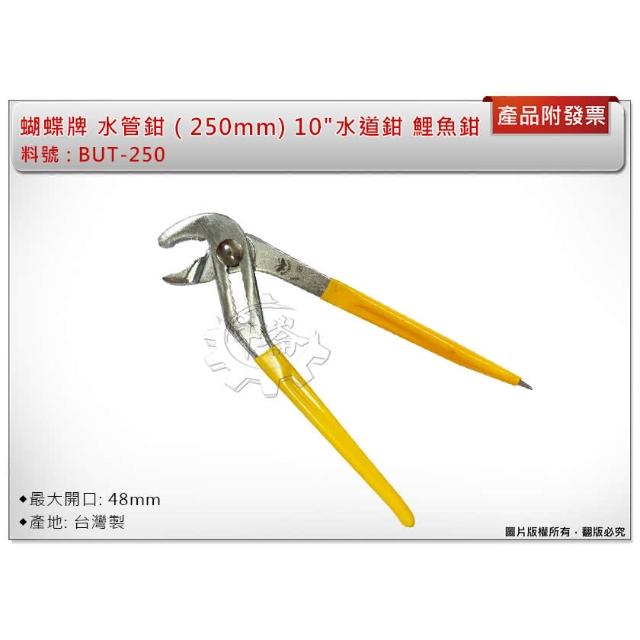 蝴蝶牌 水管鉗 250mm 10 水道鉗 BUT-250 魚嘴鉗 鯉魚鉗 防滑膠柄 台灣製 中崙五金