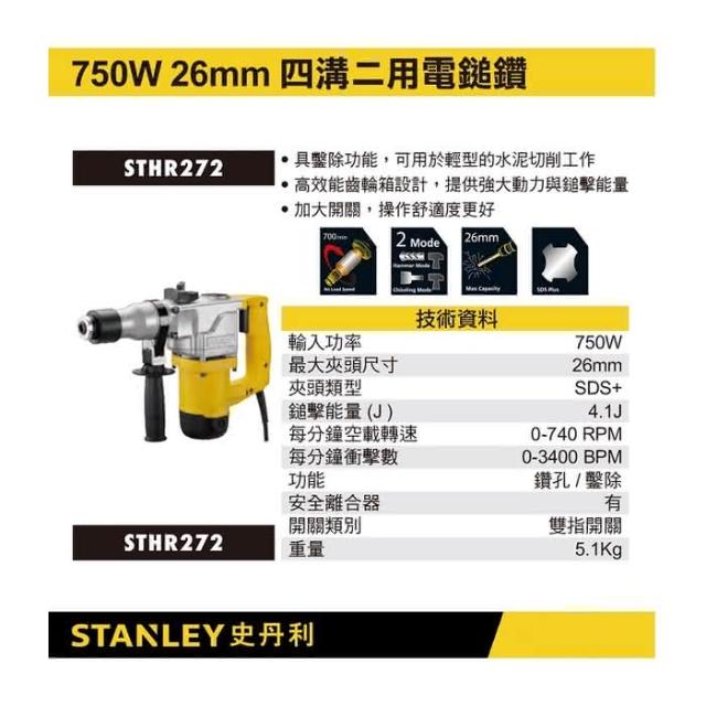 Stanley史丹利 STHR272 四溝兩用強力電錘鑽 鑿除與鑽孔 四溝免出力電鑽 電動起子機 電動螺絲起子機 電鑽起子機 中崙五金