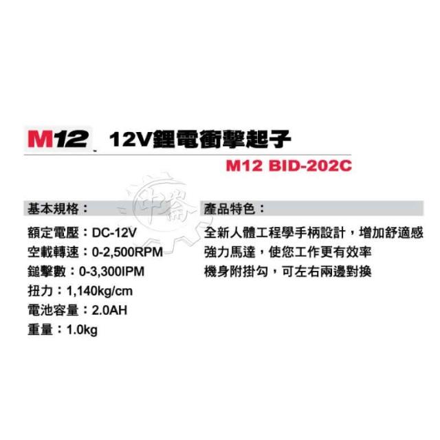 Milwaukee 美沃奇12V鋰電衝擊起子機 M12BID 單機+選項 M12 BID-202C 電動螺絲起子機 電鑽起子機 中崙五金