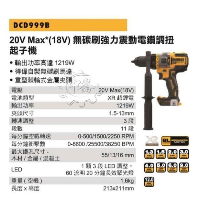 DEWALT 得偉20V無碳刷強力震動電鑽調扭起子機 DCD999B DCD999 單機+選項 電動螺絲起子機 電鑽起子機 中崙五金