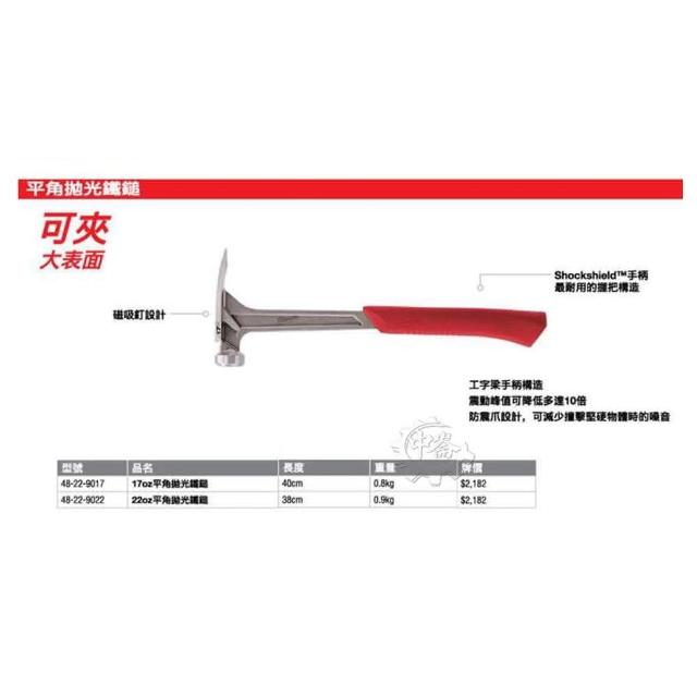 Milwaukee 美沃奇平角抛光鐵鎚 磁吸釘設計 防震把手48-22-9017 中崙五金