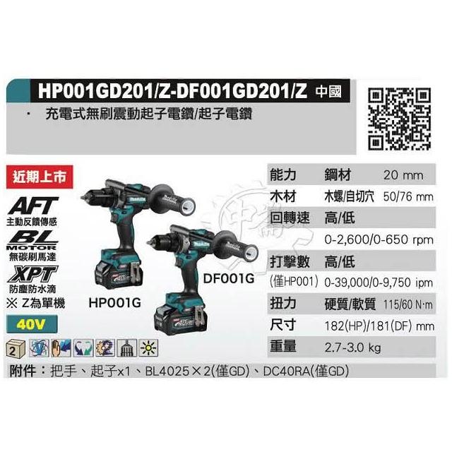 MAKITA 牧田40V充電式無刷起子電鑽 DF001GD201 DF001GZ DF001 電動螺絲起子機 電鑽起子機 中崙五金