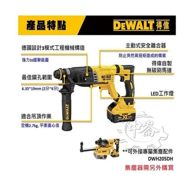 DEWALT 得偉20V無刷四溝三用電鎚鑽 DCH263P2 DCH263B 單機+選項 可搭配DWH205DH集塵器 中崙五金