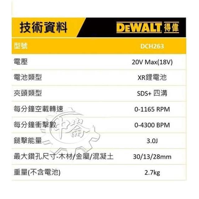 DEWALT 得偉20V無刷四溝三用電鎚鑽 DCH263P2 DCH263B 單機+選項 可搭配DWH205DH集塵器 中崙五金