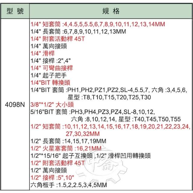 ALSTRONG台灣製 2分+4分 專業98件套筒組 ALS-4098N 適合:汽車 機車維修 中崙五金