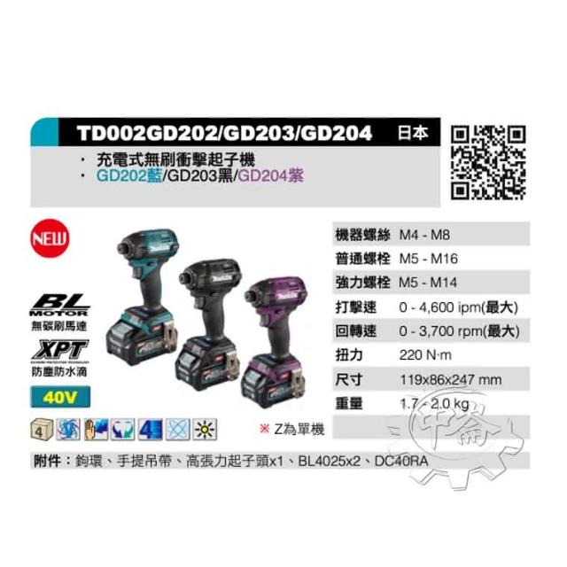 MAKITA 牧田日本製40V充電無刷衝擊起子機 TD002GD202 TD002GZ TD002 電動螺絲起子機 電鑽起子機 中崙五金