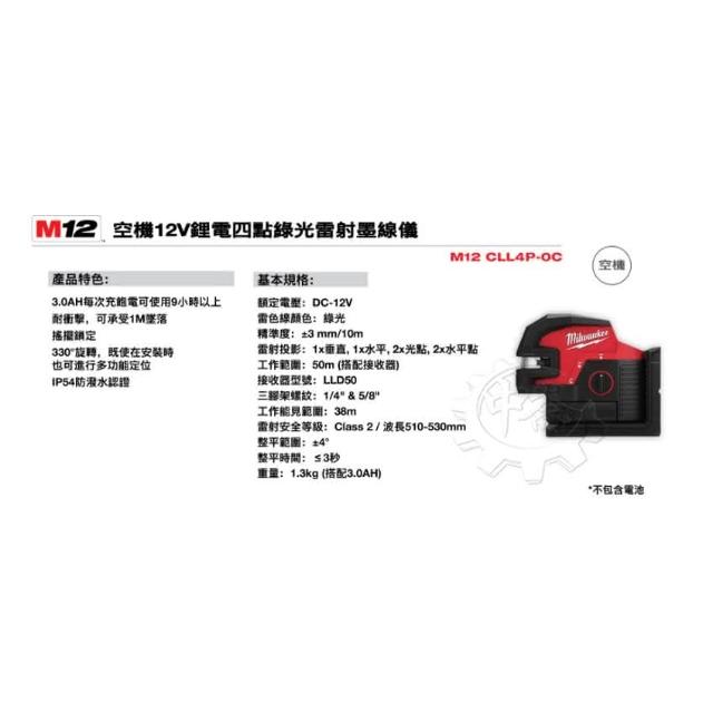 Milwaukee 美沃奇12V鋰電四點綠光雷射墨線儀 M12 CLL4P 單機+選項 M12CLL4P-5252C 水平儀 雷射儀 中崙五金
