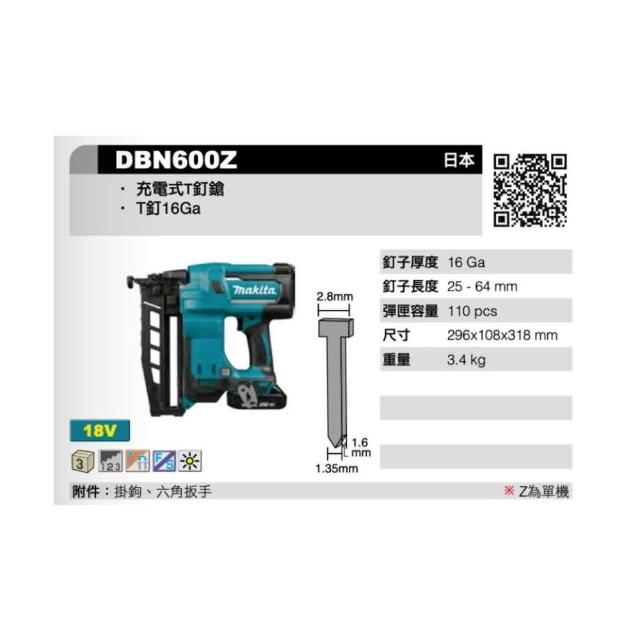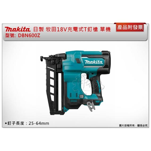 MAKITA 牧田日本製 18V充電式T釘槍 DBN600Z (單機) T針16Ga 釘子長度可裝25-64mm 中崙五金