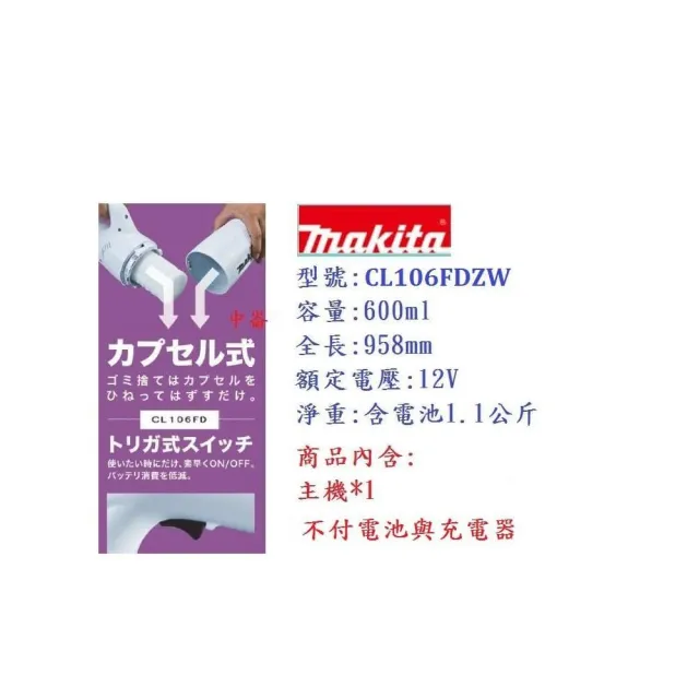 MAKITA 牧田12V 充電式吸塵器 膠囊式 CL106FDSMW(白色)單機+選項CL106FDSYW CL106FDZW 中崙五金