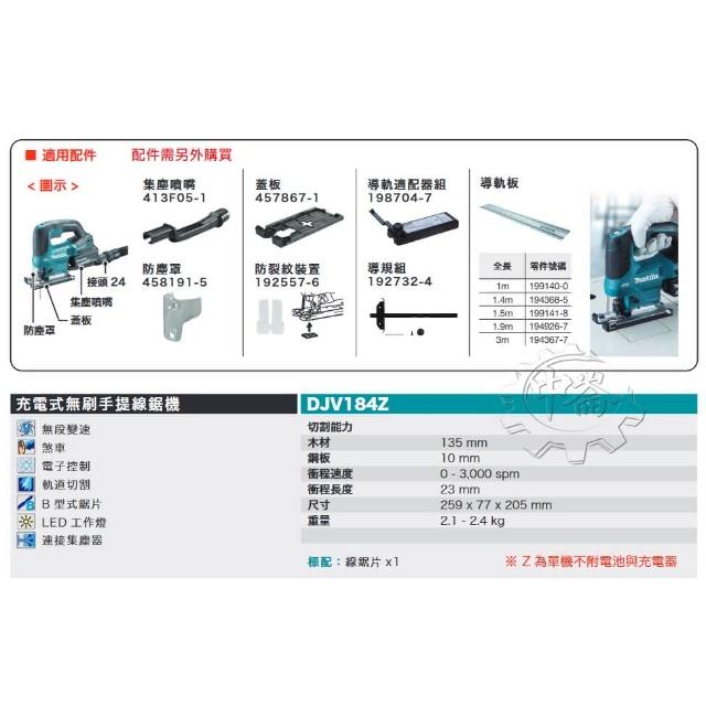 MAKITA 牧田18V 無碳刷馬達 DJV184Z DJV184 手提線鋸機 免工具換刀片 單機+選項 中崙五金